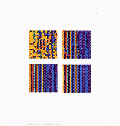 This portfolio is made of three separate series, which were generated from a square matrix produced by Nake on a Telefunken T4 computer. The matrix was multiplied successively by itself, creating new matrices that translated into images made of visual signs of a particular form and colour. Given that Nake used random number generation in this work during this period, the multiplication process was probably partly automated. The portfolio was published by the artist Hansjörg Mayer in an edition of forty.