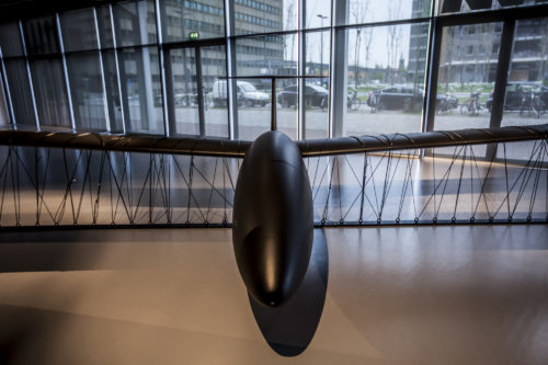 A full size replica of a drone is held down by network cables, as if ready to be freed and perform its function as a monitoring device. The unmanned flying object is regularly used to track down military objectives (be it facilities or individuals) and facilitate air strikes, making it an ominous symbol of data-driven, technological warfare that often leads to the killing of innocent people. The object is presented as a caged beast, exhibited for the entertainment of audiences but still dangerous. Its sleek black shapes make it at once seductive, reminiscent of a stylized sports car, and also mysterious and threatening.