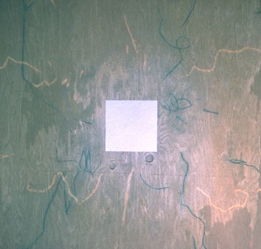 Painting by hand from the 1960's includes spontaneous gesture and highly contolled rectangular element in the same visual field.