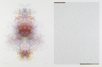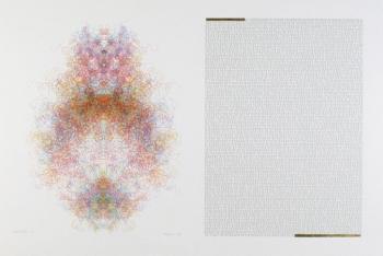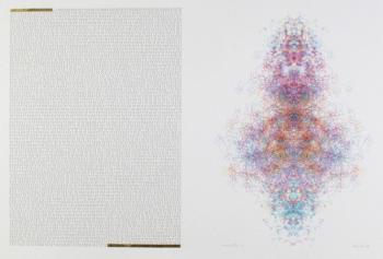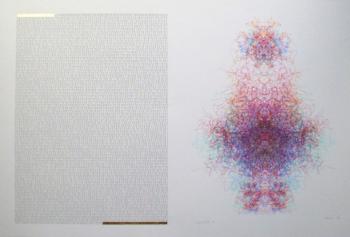 A family of algorithmic pen plotted drawings, each presented with the binary text for a Universal Turing Machine (UTM), were created for an exhibition in Manchester on the occasion of the Ninth International Symposium on Electronic Art (1998). These drawings, reminiscent of medieval manuscript illuminations, celebrate Alan Turing's work with universal problem solver procedures. They were created especially for the Manchester-Liverpool context as homage to Alan Turing in memory of his historic work in Manchester. Executed on hot pressed Arches, each piece includes a burnished gold leaf enhancement. The following links to the Verostko site provide further information on the commitment and depth to the Alan Turing UTM by Roman Verostko Essay on the UTM in 1998 that addresses parallels between the nature of "undecidable" propositions, UTM's, and the "Cloud of Unknowing" The Manchester 1998 show The 1995 SIGGRAPH art show in LA Illumininated UTM's were shown at the Tempe show Web presentation of a UTM as a self portrait of the computer with which it is viewed